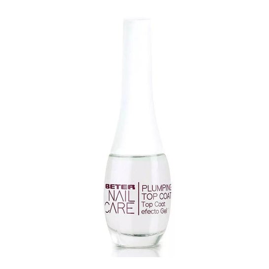 Beter Nail Care Top Coat Gel Effect 11ml cuidado para unhas esmaltadas, proporciona brilho e volume instantaneamente. Proporciona um espetacular efeito de gel nail: suave com volume e brilho cristalino sem a necessidade de uma lâmpada UV. Reduz a descoloração e o tom amarelado das unhas graças ao seu filtro UV.