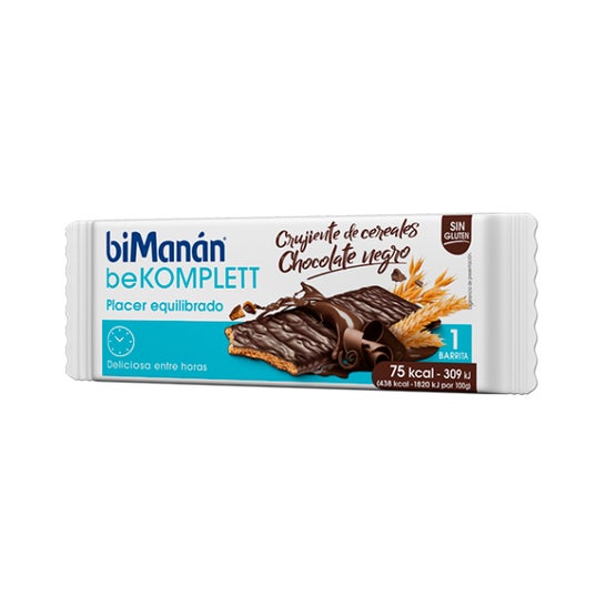 A barrita crocante biManán® Snack Chocolate Negro 1 Unidade aporta apenas 75 kcal. Elaborada à base de cereais com chocolate negro, é uma fonte de fibra deliciosa e livre de glúten.