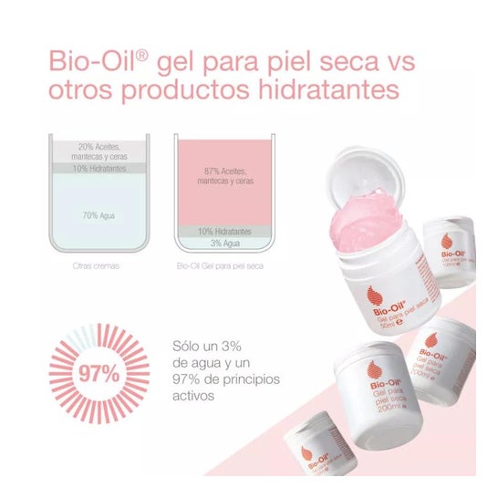 Bio Oil Gel Dry Skin 200ml é um tratamento para peles secas ou ultra-secas que actua de duas formas: passivamente, graças aos óleos e manteigas, reduz a evaporação natural da água da pele.
