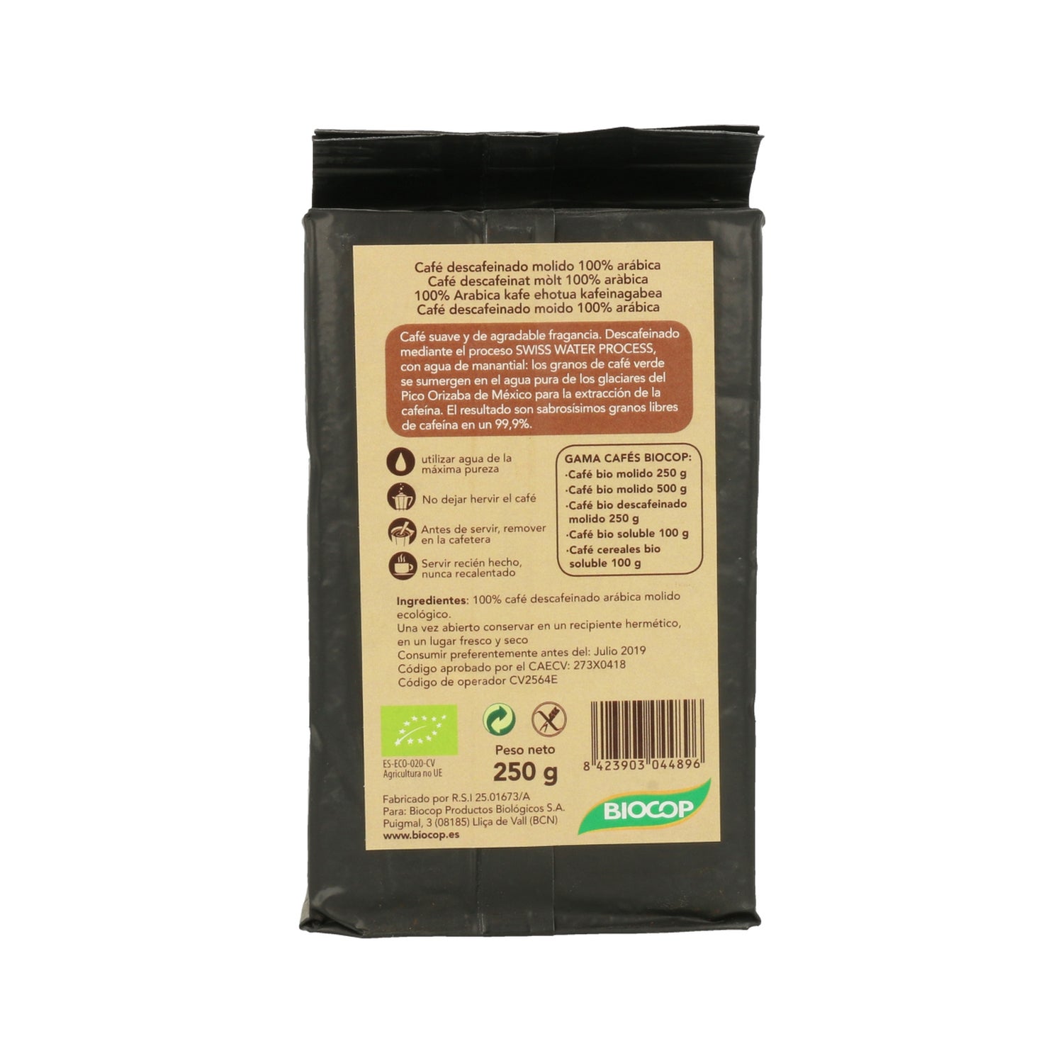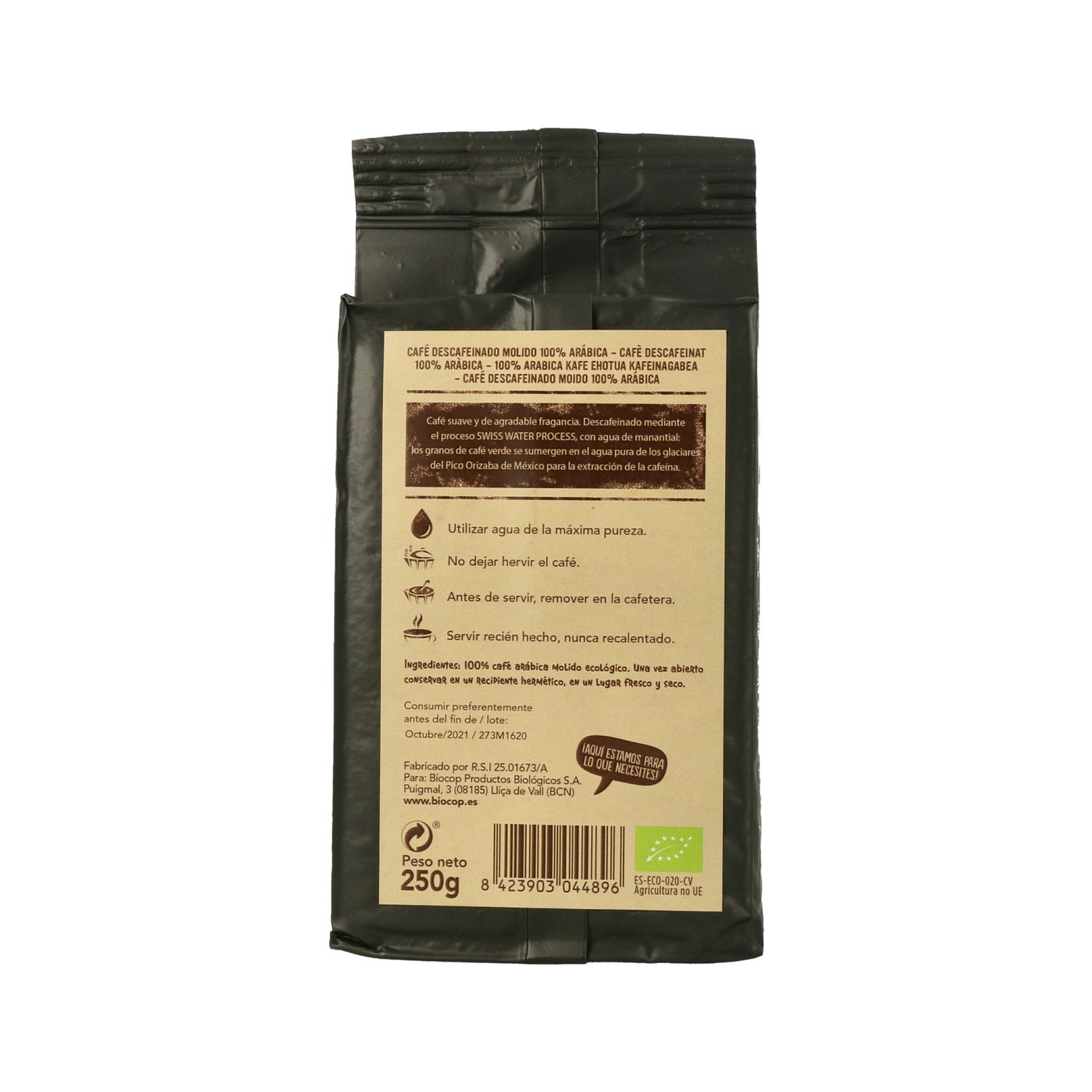 Café descafeinado da Biocop para dizer adeus à cafeína, mantendo todo o sabor. Grãos de café descafeinados com água mineral e embalados a vácuo. Café Arábica torrado e moído, que favorece o seu consumo final. Produto ecológico processado de forma natural. A Biocop procura manter as propriedades positivas do café, ao mesmo tempo que elimina possíveis toxinas. É apropriado para o consumo de todos em casa, especialmente para aqueles que desejam implementar uma alimentação rica em minerais. É importante destacar que há um equilíbrio no sabor, gerando um balanço de amargura no grão, sem distorção. Desta forma, é um produto requintado que pode encantar especialistas e conquistar aqueles que estão descobrindo o café. O consumo deste produto não é adequado para crianças pequenas.