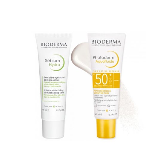 Bioderma Sébium Hydra 40ml + Photoderm Aquafluide Spf50+ 50ml é um pacote promocional projetado para ser utilizado durante tratamentos que podem causar secura na pele. Este conjunto inclui dois produtos-chave que ajudam a manter a hidratação e proteção solar.