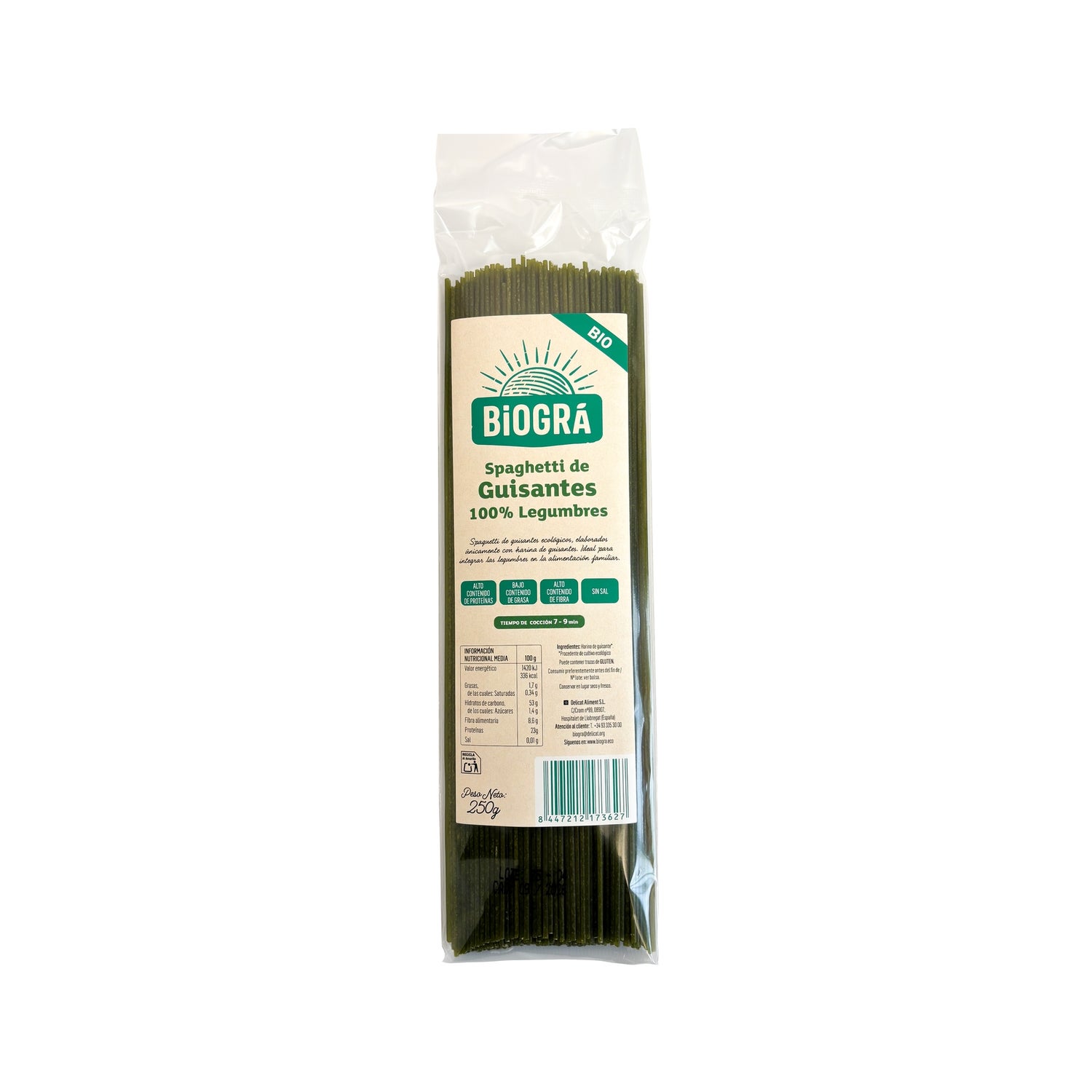 Massa ecológica elaborada a 100% com farinha de ervilhas. Estes esparguete podem ser muito úteis para incorporar pratos com legumes e/ou verduras na dieta familiar e desfrutar da sua ampla variedade de vitaminas e minerais. O esparguete de ervilhas Biográ permite a criação de receitas tão coloridas como deliciosas. Entre as virtudes que tem a ervilha como ingrediente principal ou complemento da massa, podemos mencionar: a ervilha tem poder antioxidante; é uma boa fonte de proteína vegetal; é rica em fibra dietética; cada porção proporciona efeito de saciedade; durante a digestão é fácil de digerir e favorece o trânsito intestinal; é um alimento baixo em gordura e sal. É um produto vegano e sem lactose. O seu alto consumo diminui o risco de doenças cardiovasculares, certos cancros e outras doenças crónicas.