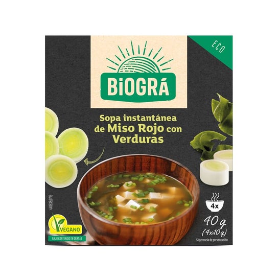 A sopa de miso é servida como acompanhamento na gastronomia oriental japonesa. Ao acompanhar esta sopa com arroz e legumes, torna-se num prato com ingredientes saudáveis e nutritivos. É servida ao pequeno-almoço, almoço e jantar, mas geralmente é consumida como reconstituinte durante constipações. Além disso, desintoxica o organismo e previne doenças intestinais. É ideal para os períodos de muito frio e por vezes acompanha refeições como sushi. É realmente muito fácil de preparar, basta adicionar um pacote de Sopa Miso à quantidade de água necessária para uma pessoa e adicionar os ingredientes desejados. É um produto indispensável para os dias em que não há tempo para cozinhar e uma ótima fonte de fibra. Adequado para veganos. É recomendado pela marca Biográ.