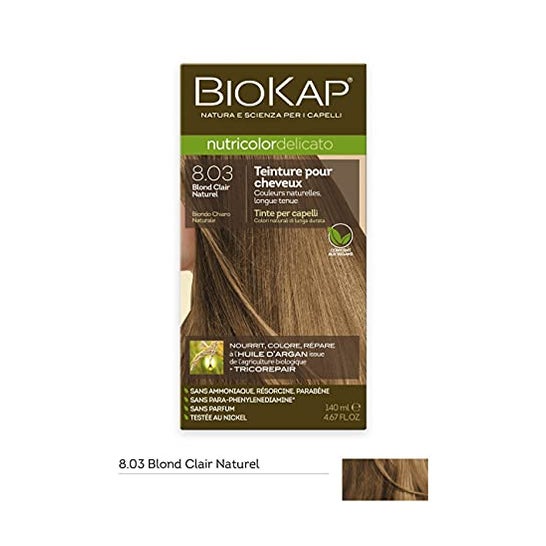 Biokap Delicato 8.03 Loiro Natural 140ml é uma coloração permanente projetada para quem deseja um tom loiro natural e brilhante, cuidando da saúde do cabelo. Sua fórmula exclusiva, que inclui ingredientes vegetais e é de alta tolerância dérmica, a torna adequada para pessoas com couro cabeludo sensível ou com tendência a alergias.