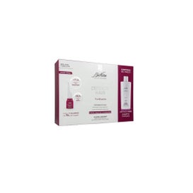Conjunto de tratamento capilar que ajuda a fortalecer o cabelo. Inclui loção em ampolas e um champô, produtos que contêm uma fórmula que ajuda a reparar o cabelo a partir da raiz, proporcionando brilho e suavidade.