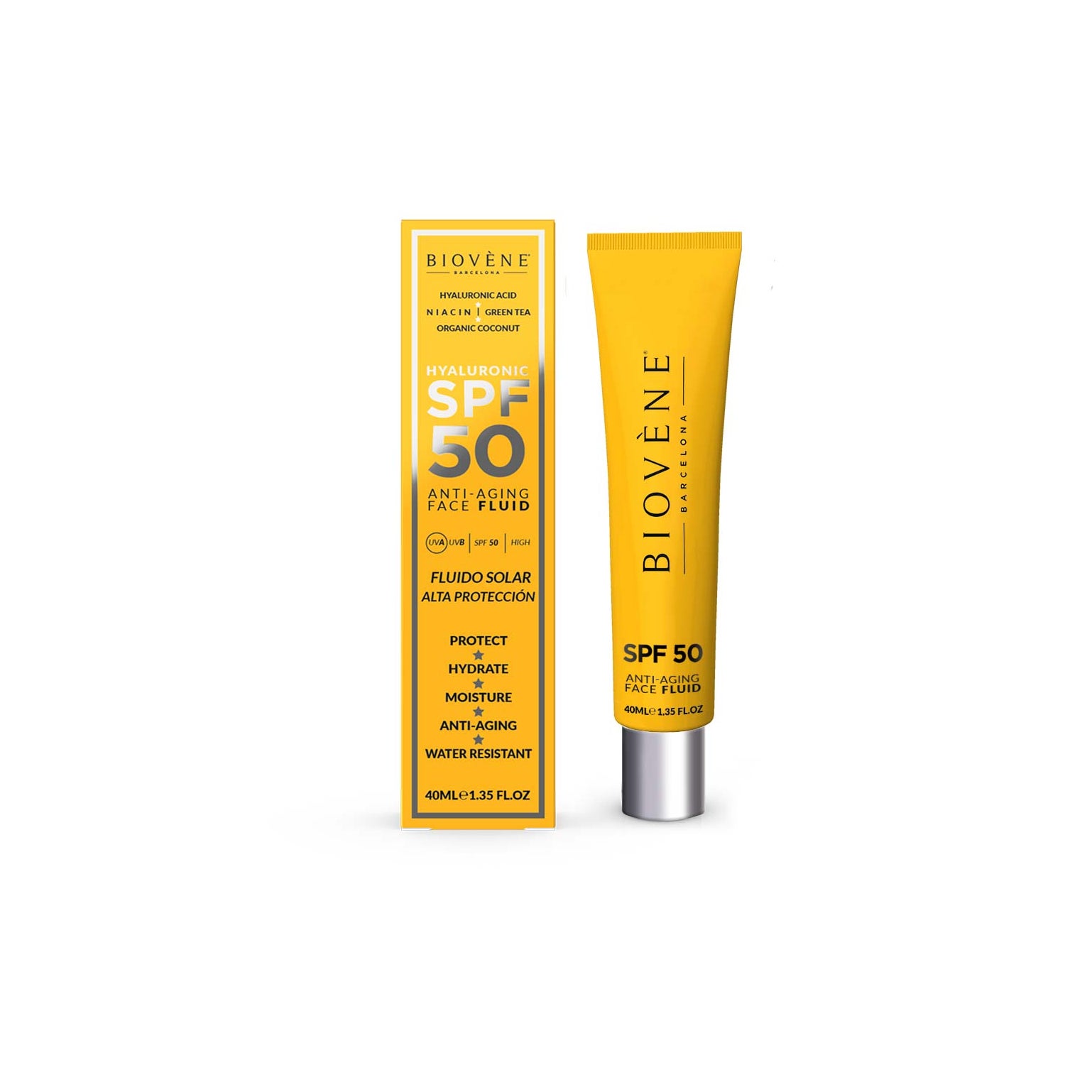 Biovène Hyaluronic Spf50 Anti-Aging Face Fluid 40ml é um fluido facial de proteção solar projetado para oferecer uma alta defesa contra o fotoenvelhecimento. Este produto, ideal para os dias quentes de verão, conta com uma fórmula leve que é rapidamente absorvida pela pele.