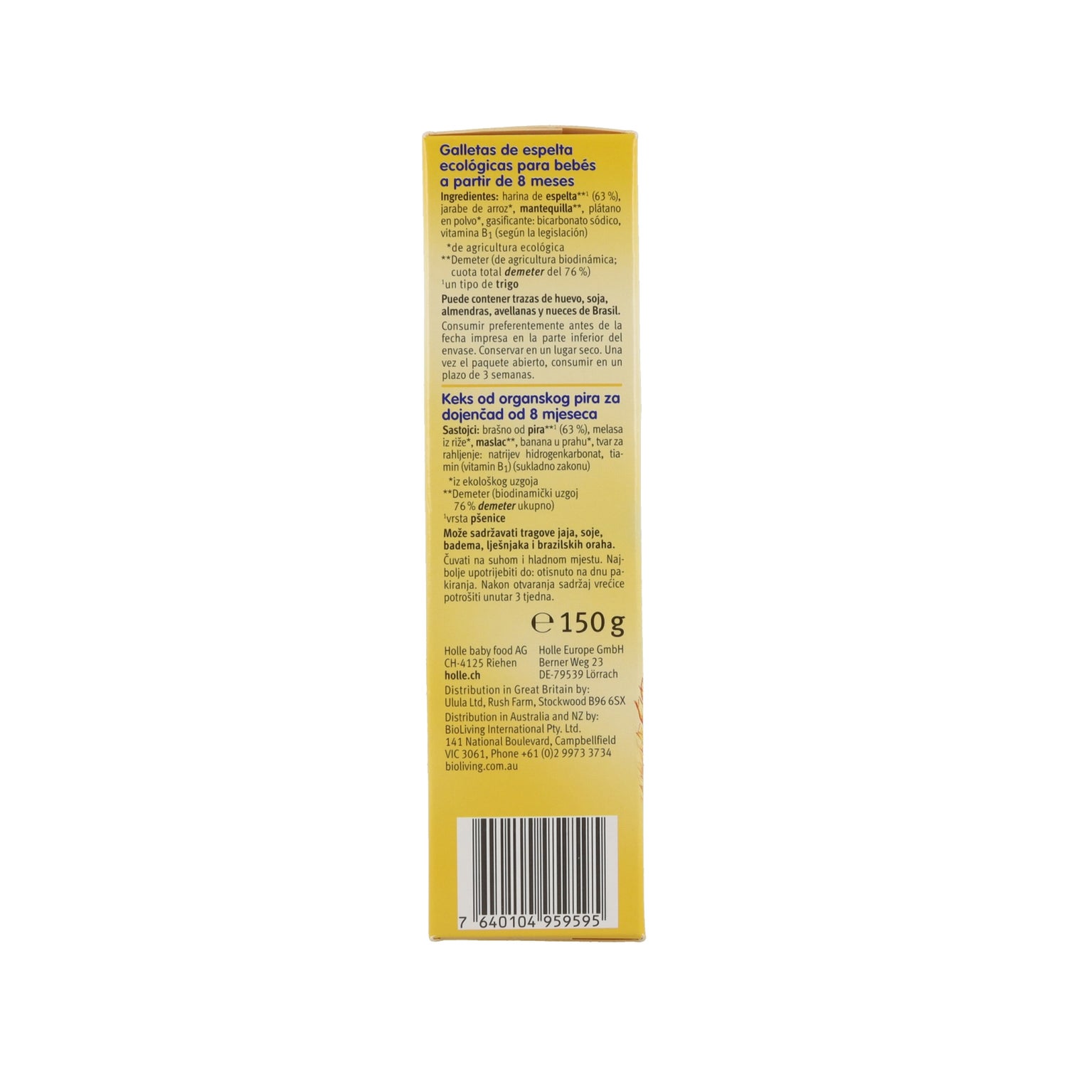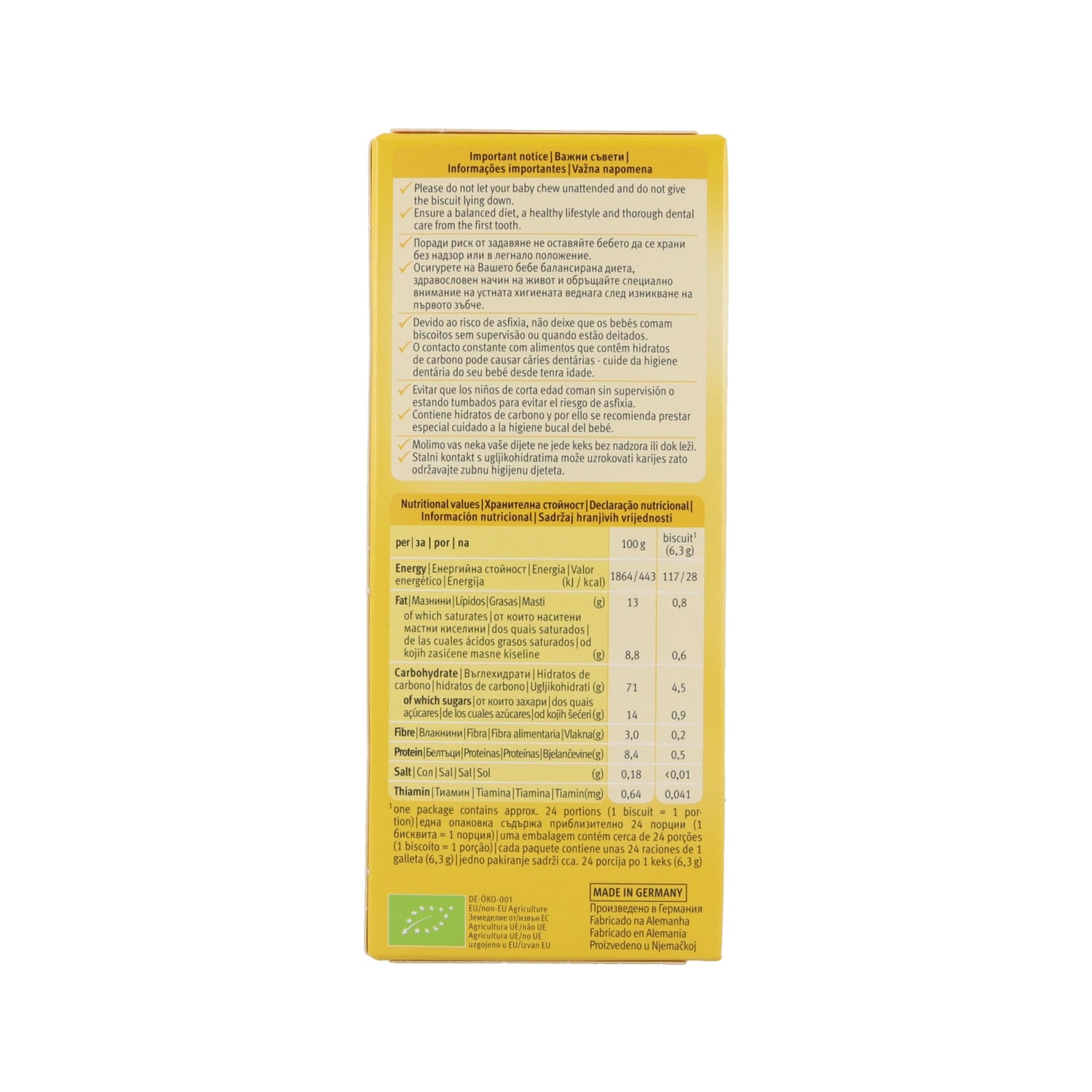 Biscoitos para bebés feitos de farinha integral 100% de farinha de espelta orgânica. Recomendado contribuir para a alimentação complementar a partir dos 8 meses de idade. Contêm banana, manteiga, amido de arroz e bicarbonato de sódio. São fáceis de digerir e contribuem para o desenvolvimento adequado dos mais pequenos. Enriquecido com vitamina B1, que ajuda ao desenvolvimento adequado do sistema nervoso central. É um produto orgânico certificado.