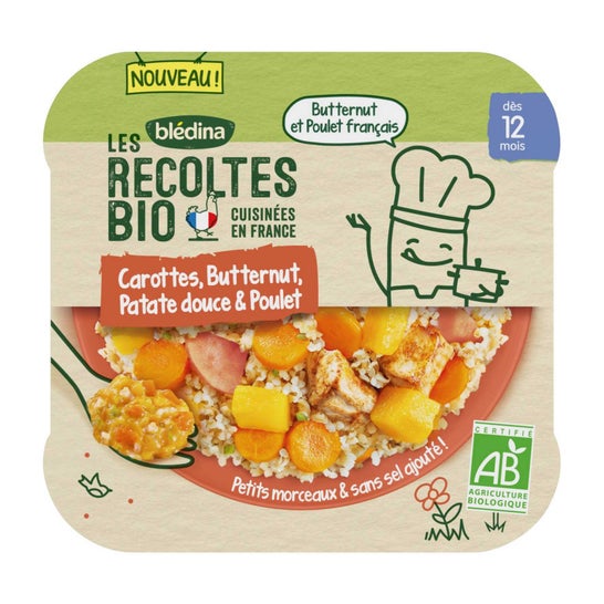 Delicioso prato para bebés a partir dos 12 meses de idade, que ajuda os mais pequenos a descobrir novos sabores e texturas de forma saudável e saborosa. Elaborado com cenouras, abóbora, bulgur, frango e outros legumes, todos de origem biológica certificada, e cozinhado de forma tradicional nas instalações de Brive-la-Gaillarde, em França.