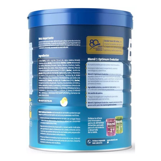 Este leite é recomendado para bebês desde o nascimento até os 6 meses de idade, quando o leite materno não é possível. A nova fórmula Blemil Optimum Evolution incorpora novos ingredientes como 5 HMOs, im® pro (6 probióticos) e proteína a2, evoluindo a partir do Blemil Optimum ProTech.