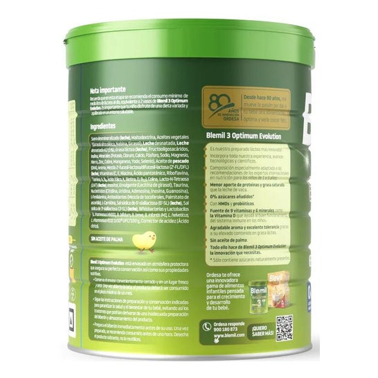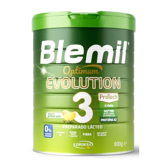 Blemil® 3 Optimum Evolution 800g é um leite de crescimento indicado para crianças de 1 a 3 anos. Contém uma exclusiva combinação de compostos bioativos que favorecem o crescimento dos pequenos. Esta fórmula protetora inclui proteína a2 para uma fácil digestão, im1 pro® com 6 probióticos e 5 HMOs presentes no leite materno. Além disso, não contém açúcares adicionados e tem um menor aporte de proteínas e gordura saturada do que o leite de vaca. Com alto teor de vitaminas e minerais, como a vitamina d que ajuda o sistema imunológico. Também contém Frutooligossacarídeos como fibra solúvel e não tem óleo de palma. Um biberão deste leite aporta cerca de 50% do dha necessário para uma criança e cerca de 40% das necessidades de vitamina d, ferro e iodo. É recomendado a partir do ano de idade, como parte de uma dieta equilibrada. Não recomendado para alérgicos a produtos lácteos.