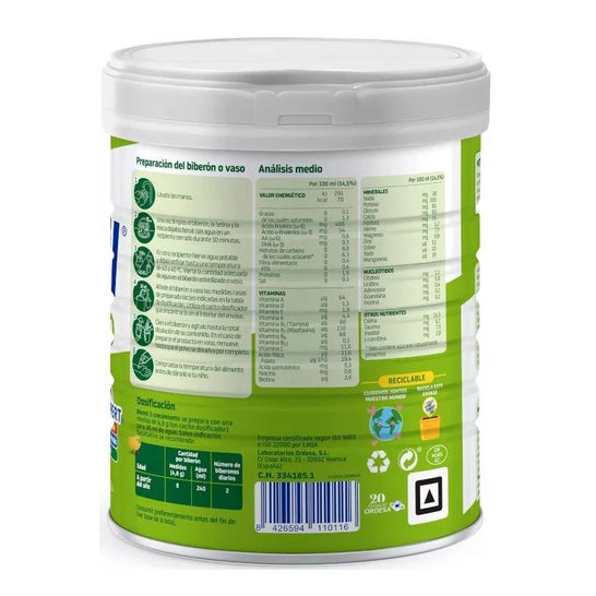 Leite desnatado, óleos vegetais (óleo de palma, palmiste, nabo silvestre, girassol, girassol de alto teor de ácido araquidônico (AA), açúcar, dextrinomaltose, fruto-oligossacar)(Sódio, Potássio, Cálcio, Fósforo, Magnésio, Ferro, Zinco, Cobre, Manganês, Iodo), Aroma de Baunilha, Emulsionante (Lecitina de Soja), Complexo Vitamínico (Vitaminas): C, E, Nicotinamida, Pantotenato de Cálcio, B6, A, B1, B2, Ácido Fólico, K, Biotina, D, B12), Taurina, Nucleótidos (Monofosfatos de..: Citidina, Uridina dissódica, Adenosina, Inosina dissódica, Guanosina dissódica), Antioxidantes (Mistura de Tocoferóis e Palmitato de Ascorbilo), Inositol, Óleo de peixe (fonte de DHA), L-Carnitina, Lactobacilos e BIfidobactérias (Bifidobacterium infantis e Lactobacillus rhamnosus).
