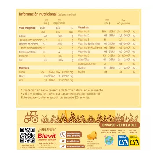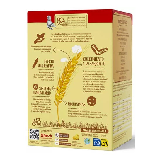 Blevit® Superfibra Multicereais Muesli 500g é uma papinha de cereais que ajuda no crescimento do bebê. Elaborado à base de 90% de cereais (trigo, arroz, milho, centeio, aveia integral, trigo sarraceno, espelta, cevada), além de fornecer vitaminas, minerais e um alto teor de fibra.