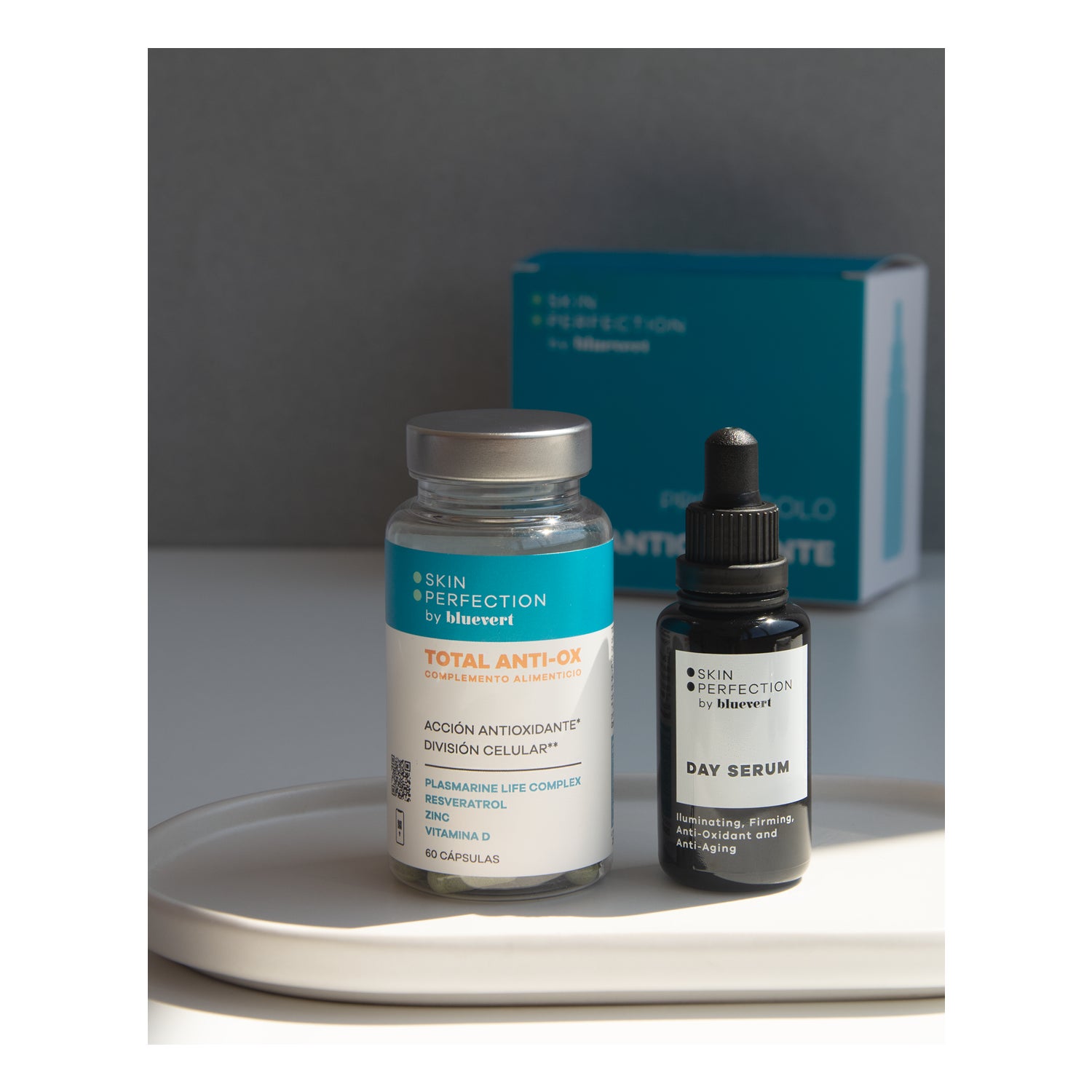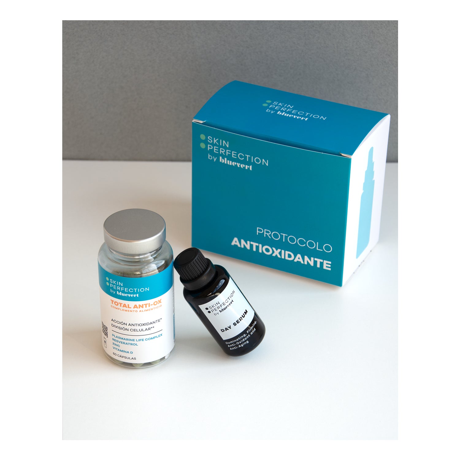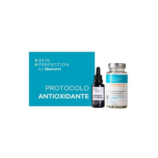 Bluevert Skin Perfection Pack Protocolo Antioxidante é um conjunto de cuidados faciais antienvelhecimento que combina a potência antioxidante mais avançada na forma de sérum com um exclusivo complemento alimentar para proteger e revitalizar as células de dentro para fora. Sua fórmula, enriquecida com microalgas marinhas e uma alta concentração de antioxidantes naturais, ajuda a frear os sinais do envelhecimento, melhorar a saúde geral e potencializar o efeito dos tratamentos cosméticos.