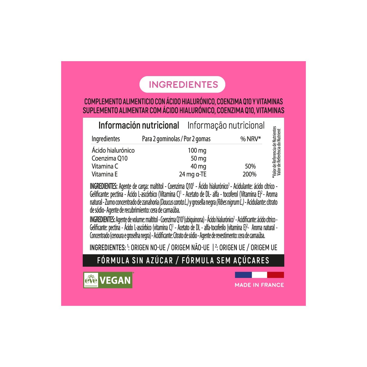Contém vitaminas C e E, com propriedades antioxidantes, que ajudam a combater os sinais da idade. Também inclui ácido hialurônico, elemento que colabora na produção de colágeno para uma pele mais firme. Além disso, essas gomas contêm Coenzima Q10, um potente antioxidante que reforça o efeito revitalizante da pele.