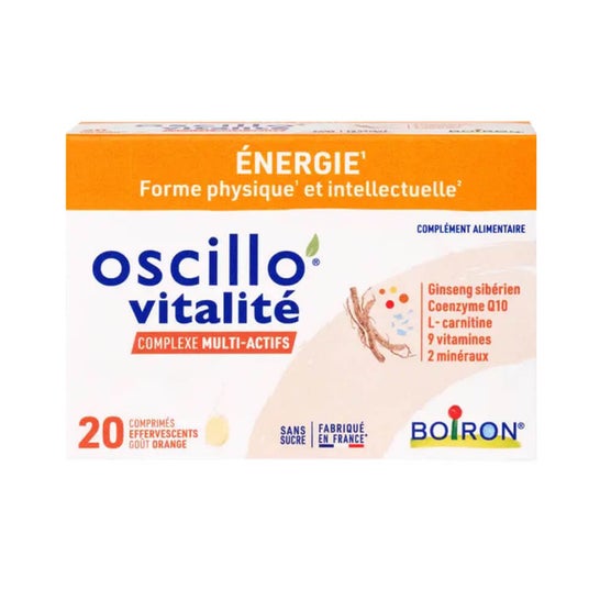 Boiron Oscillo' Vitalité Laranja 20comp é um complemento alimentar que apresenta uma inovadora combinação de 14 ingredientes ativos em forma de tabletes efervescentes. Este produto foi projetado para contribuir para a manutenção da forma física e apoiar o desempenho intelectual, assim como para ajudar a reduzir a fadiga em adultos.