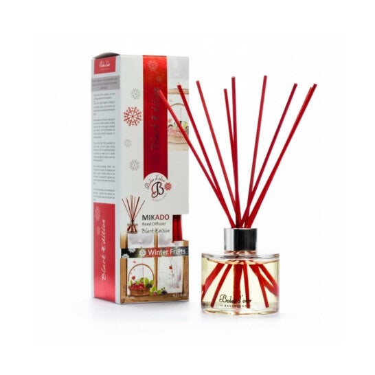 Ambientador doméstico em formato mikado, contendo uma delicada e agradável fragrância frutada, ideal para perfumar qualquer sala fechada. Contém notas de topo de folhas de framboesa, morangos silvestres e menta, notas de coração de mirtilos, ameixas e framboesas e notas de base de gengibre e pimenta. Os paus de rotim naturais ajudam a distribuir uniformemente a fragrância. Dura aproximadamente 10 semanas.