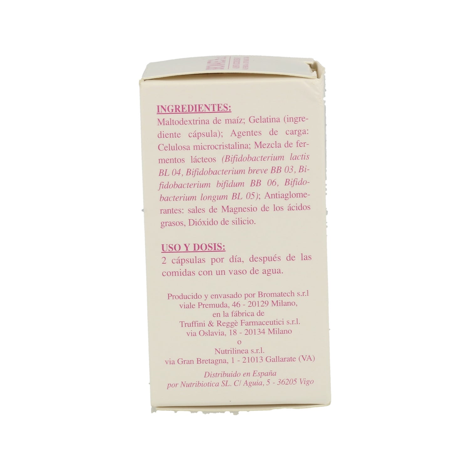 Suplemento alimentar que promove o equilíbrio da flora intestinal. Formulado com bifidobactérias, bactérias do ácido lático com ação probiótica. Combina Bifidobacterium lactis BL 04, Bifidobacterium breve BB 03, Bifidobacterium bifidum BB 06 e Bifidobacterium longum BL 05. Não exceder a dose diária recomendada e manter fora do alcance das crianças com menos de 3 anos de idade.