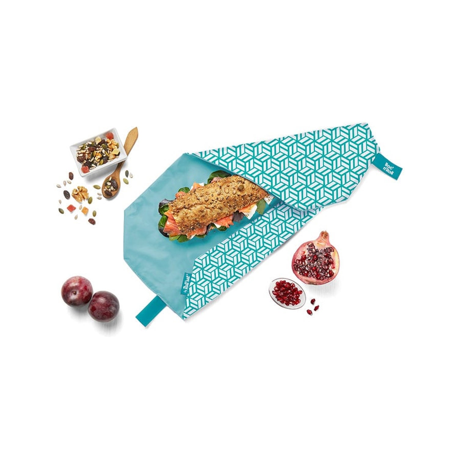 Saco de tecido reutilizável adequado para o transporte de sanduíches e alimentos em segurança. É um porta sanduíche ajustável, dobrável e lavável. Feito de material 100% ecológico para facilitar a alimentação fora de casa. Ajuda a substituir os invólucros plásticos descartáveis. Contém um fecho fácil. É muito prático, leve, fácil de lavar. Serve como uma toalha de mesa. Tem um desenho padronizado com formas geométricas impressas em tons de verde.
