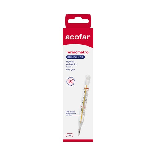 O termômetro de galinstan de Acofar é um objeto de vidro com um líquido sem mercúrio, mas com galinstan, uma mistura inofensiva e ecológica de gálio, índio e estanho.