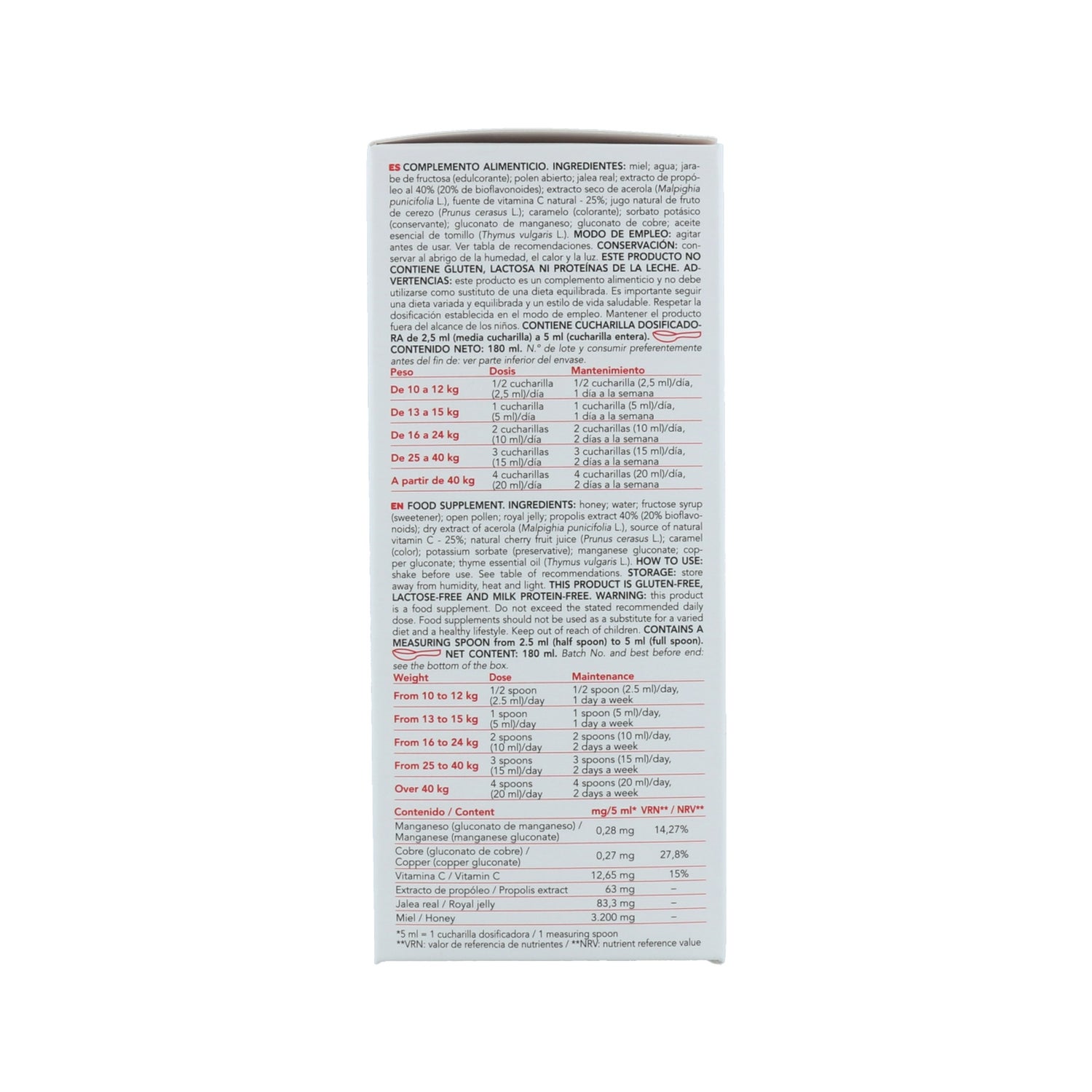 Graças à sua combinação demel, própolis e geleia realjuntamente com ovitamina C e oligoterapiafazem deste xarope uma fórmula ideal para reforçar o sistema imunitário das crianças.