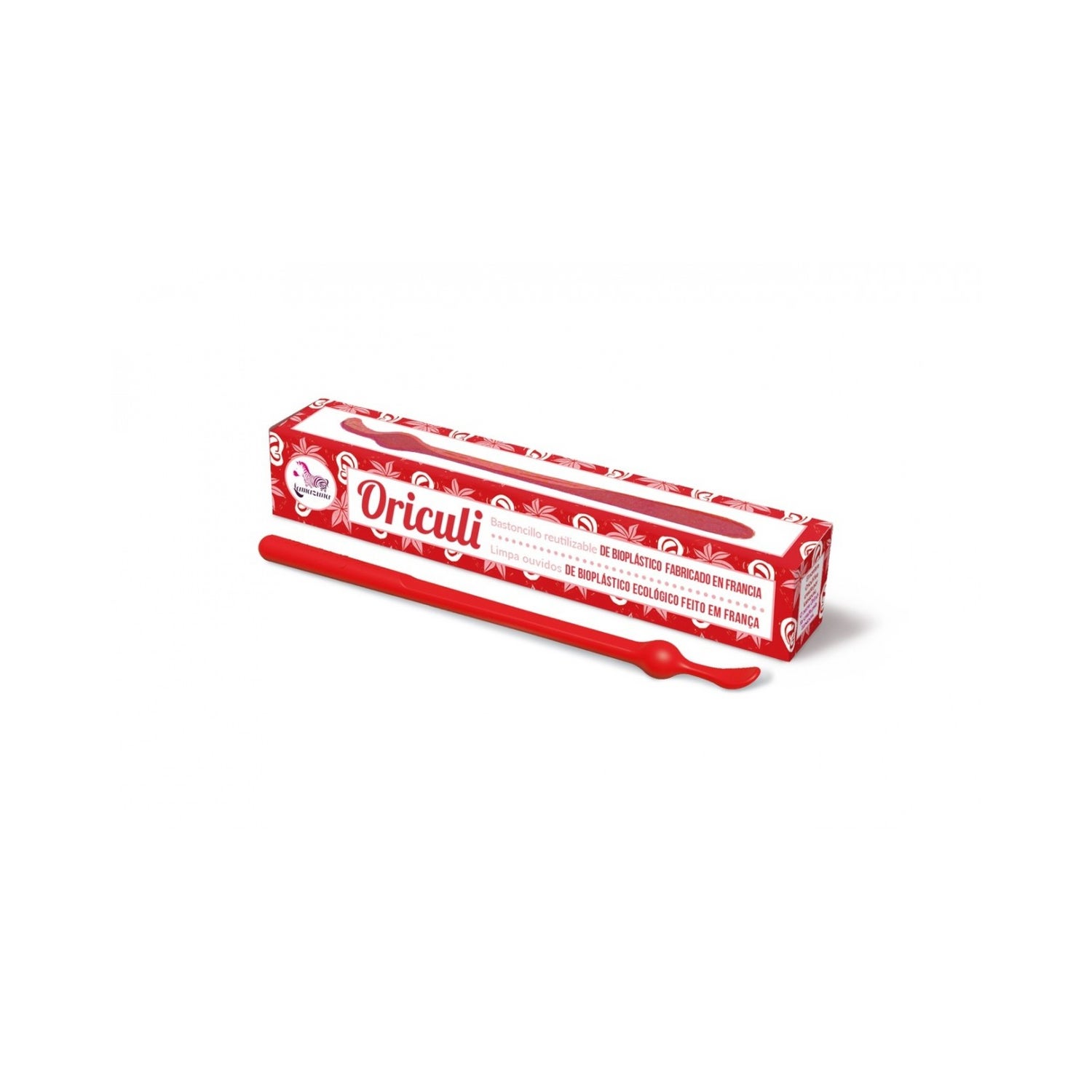 Cotonete de cor vermelha reutilizável para o ouvido Oriculi da Lamazuna. Feito de bioplástico 100% ecológico e muito resistente. Ajuda a prevenir a formação de tampões de cera. É mais econômico e sustentável. Usa-o para remover a cera visível. Zero desperdício. Cruelty free. Vegan.