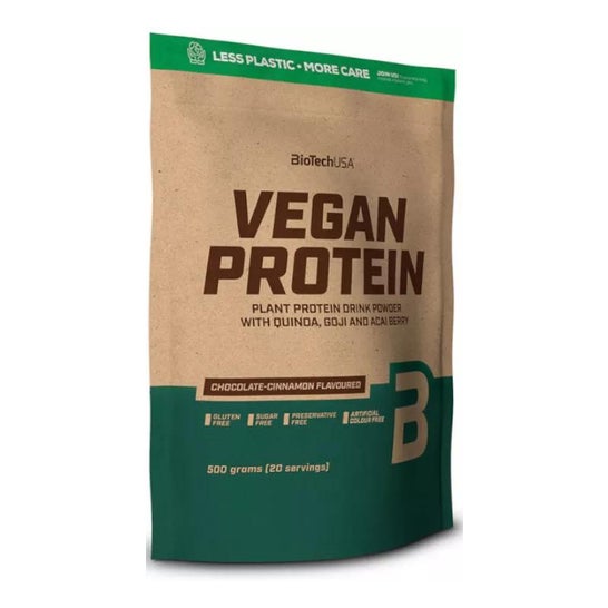 Proteína Vegana Chocolate-Canela Biotech Vegan Protein 500g A Proteína Vegana Chocolate-Canela da Biotech USA é um pó de proteína vegana de alta qualidade desenhado para atletas veganos que procuram aumentar o seu consumo proteico. Esta mistura combina proteínas de arroz e ervilhas, juntamente com aminoácidos funcionais adicionados. Além disso, não contém açúcar, lactose nem glúten. O seu sabor delicioso a chocolate e canela provém de ingredientes naturais como bagas de goji e açaí em pó, farinha de quinoa e edulcorantes naturais. A farinha de quinoa, um superalimento rico em proteínas, vitaminas e minerais, contribui para melhorar o desempenho físico. Por outro lado, as bagas de goji e açaí são antioxidantes que ajudam a proteger o corpo contra os radicais livres e promovem a saúde. Os edulcorantes naturais oferecem uma alternativa saudável ao açúcar refinado, tornando a Proteína Vegana Chocolate-Canela numa opção saborosa e benéfica para desportistas preocupados com o seu bem-estar. Recomenda-se não exceder a dose diária recomendada. Os suplementos alimentares não devem substituir uma dieta equilibrada e saudável.