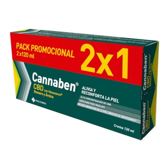 Cannaben Crema 2x120 ml é um produto de uso tópico que combina Cannabidiol (CBD) em alta concentração, óleo essencial de Alecrim e extrato de Arnica. Esta crema também inclui óleo Neossance® Squalane, que favorece uma melhor liberação do CBD na pele. Sua aplicação, realizada por meio de uma suave massagem, proporciona uma rápida sensação de alívio e conforto, contribuindo para a manutenção do estado ótimo da pele.
