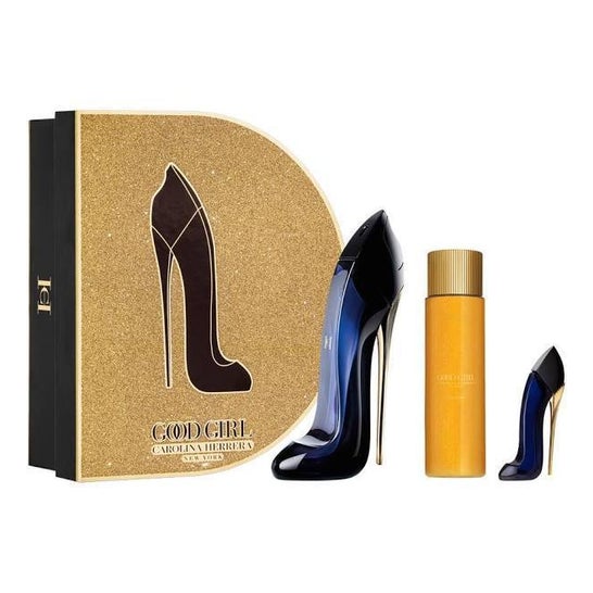 Cofre de perfumes e óleo hidratante. O perfume Good Girl pertence à família olfativa floral oriental, lançado em 2016 pela perfumista Louise Turner. Inspirado na mulher moderna e na noite de Nova Iorque, o design do frasco é um belo sapato de salto alto. Com um aroma à base de jasmim, sambac, tuberosa e raízes de lírio. As notas de fundo são de cacau e baunilha. Uso diário. Indicado para todos os tipos de pele. O conjunto contém um perfume vaporizador de 80ml e um perfume em formato de viagem. Com um creme hidratante com a mesma fragrância, de 100ml.