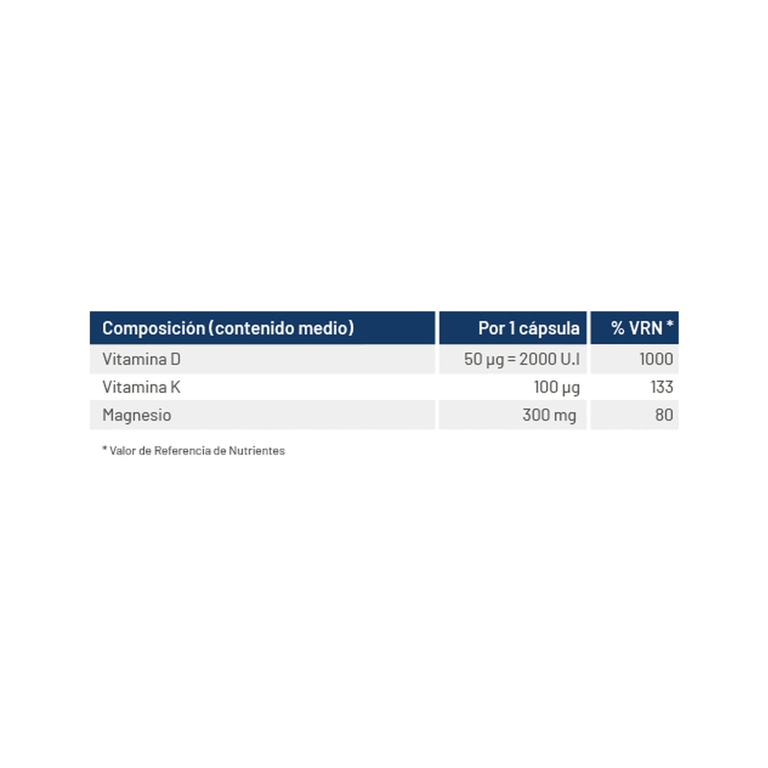 Suplemento alimentar com vitamina D, magnésio e vitamina K2, recomendado para ajudar a manter o sistema muscular e os ossos do corpo saudáveis. A vitamina K também contribui para a boa coagulação do sangue. Produzido pela empresa CEFAK no âmbito da linha de produtos de saúde. Este suplemento alimentar pode ser tomado diariamente como um suplemento dietético, 1 cápsula por dia com uma refeição. É adequado para celíacos e pessoas alérgicas ou intolerantes às proteínas do leite, da lactose, do ovo ou da carne. Pode também ser tomado por qualquer pessoa que pretenda fortalecer os seus ossos e manter os seus músculos saudáveis e firmes. É contraindicado para pessoas em tratamento com anticoagulantes e para crianças com menos de 4 anos de idade. A dose recomendada não deve ser excedida, pois pode ser contraproducente.
