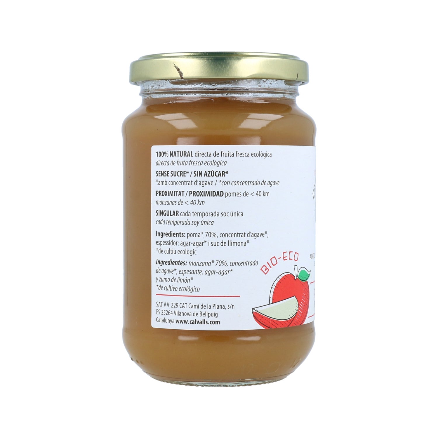 É uma compota de maçã sem açúcar, feita com ingredientes orgânicos. Adoçada com frutose dietética natural. As maçãs contêm vitamina C e vitamina E. Fornecem minerais como potássio e fósforo. Com propriedades antioxidantes devido aos fitoquímicos que contém, como os polifenóis. Adequado para diabéticos. Sem conservantes nem corantes. Produto elaborado na Catalunha.