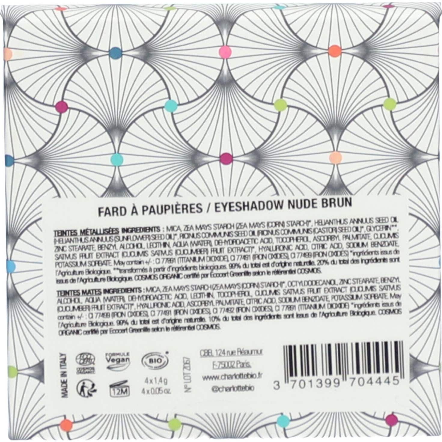 Charlotte Bio Palette Fard à Paupières Nude Brown 4x1.4g é uma paleta de sombras de olhos que se destaca pela sua composição ecológica e vegana. É elaborada com 99,5% de ingredientes de origem natural, dos quais 20% conta com certificação ecológica. Esta fórmula cumpre com os rigorosos padrões dos certificados Ecocert e Cosmébio, garantindo assim uma qualidade excepcional.