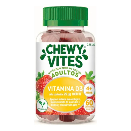 Suplemento alimentar em gomas com sabor a morango, formulado com vitamina D3. Promove o funcionamento normal do sistema imunitário e contribui para a manutenção dos dentes e ossos. Adequado apenas para adultos.
