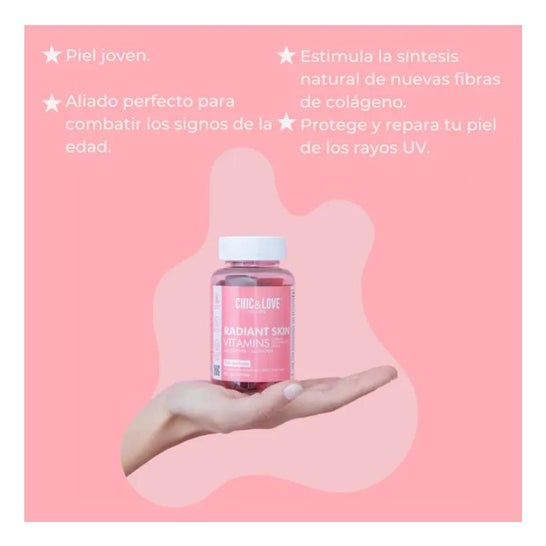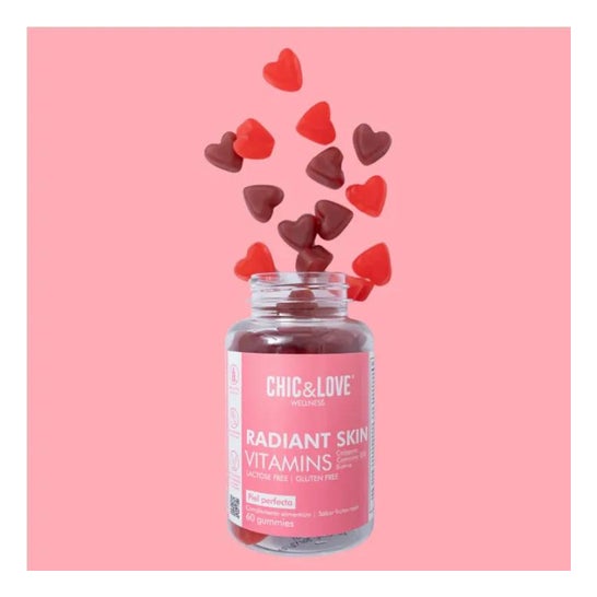 Chic & Love Radiant Skin Vitamins 60 pcs é um suplemento alimentar em formato gomoso que ajuda a proteger o corpo contra o stress oxidativo que causa o envelhecimento prematuro. É enriquecido com coenzima Q10 e vitaminas que promovem a produção natural de colagénio na pele. Adequado para veganos. Sabor a bagas vermelhas.