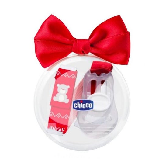 Chicco CLIP CATENELLA NATALE 1ud é uma prendedor transparente para chupeta, que conta com uma fita vermelha e estampada com um ursinho.