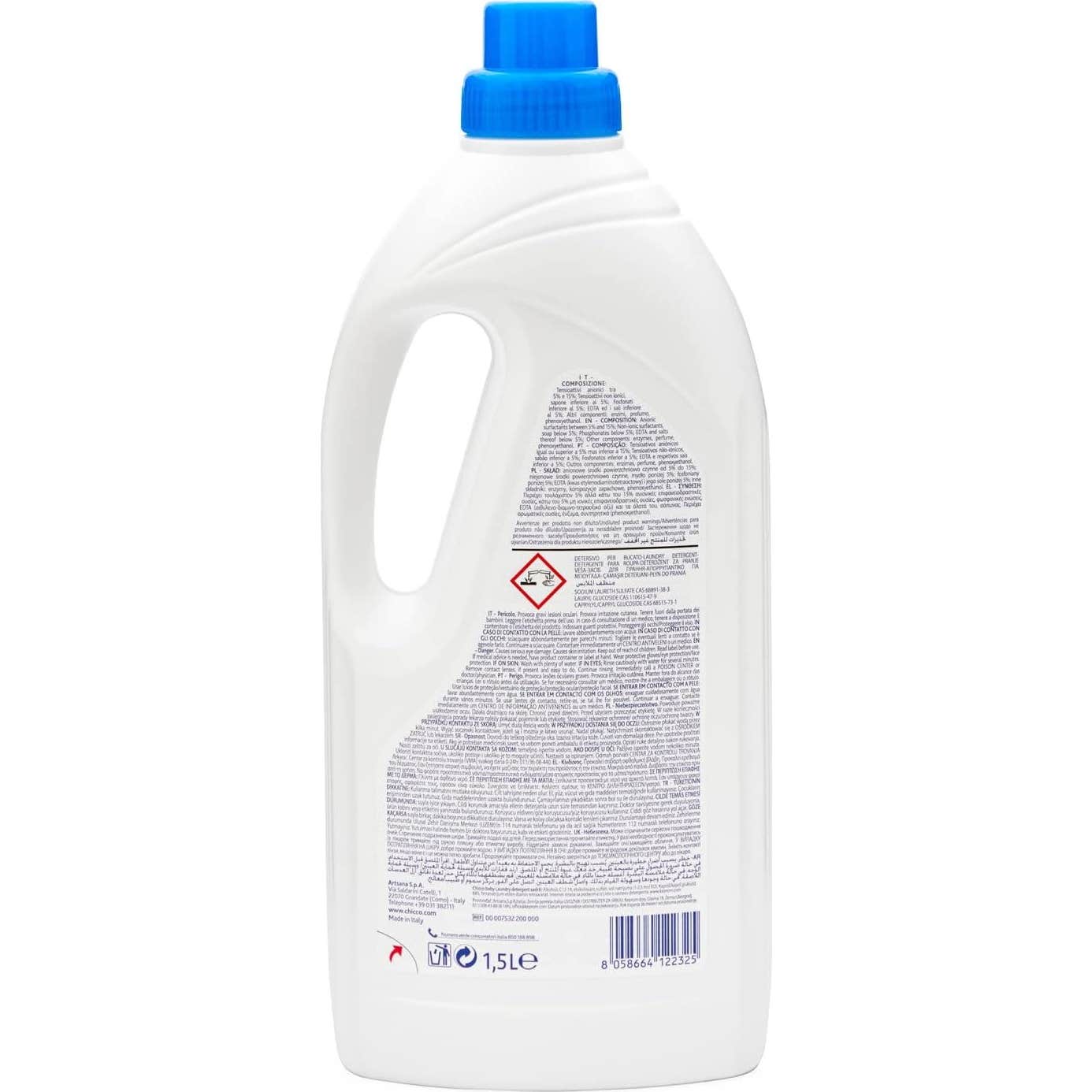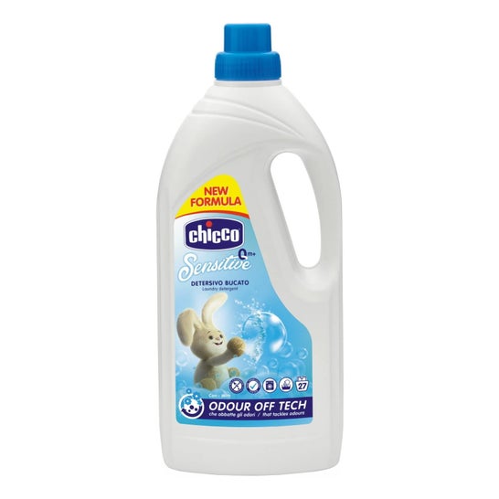 Chicco Detergente Roupas Sensitive 1.500 ml é um produto formulado especificamente para o cuidado das roupas infantis. Sua composição inclui Aloe Vera, conhecido por suas propriedades de limpeza, o que permite eliminar de maneira eficaz as manchas e os odores que podem afetar as peças dos mais pequenos.