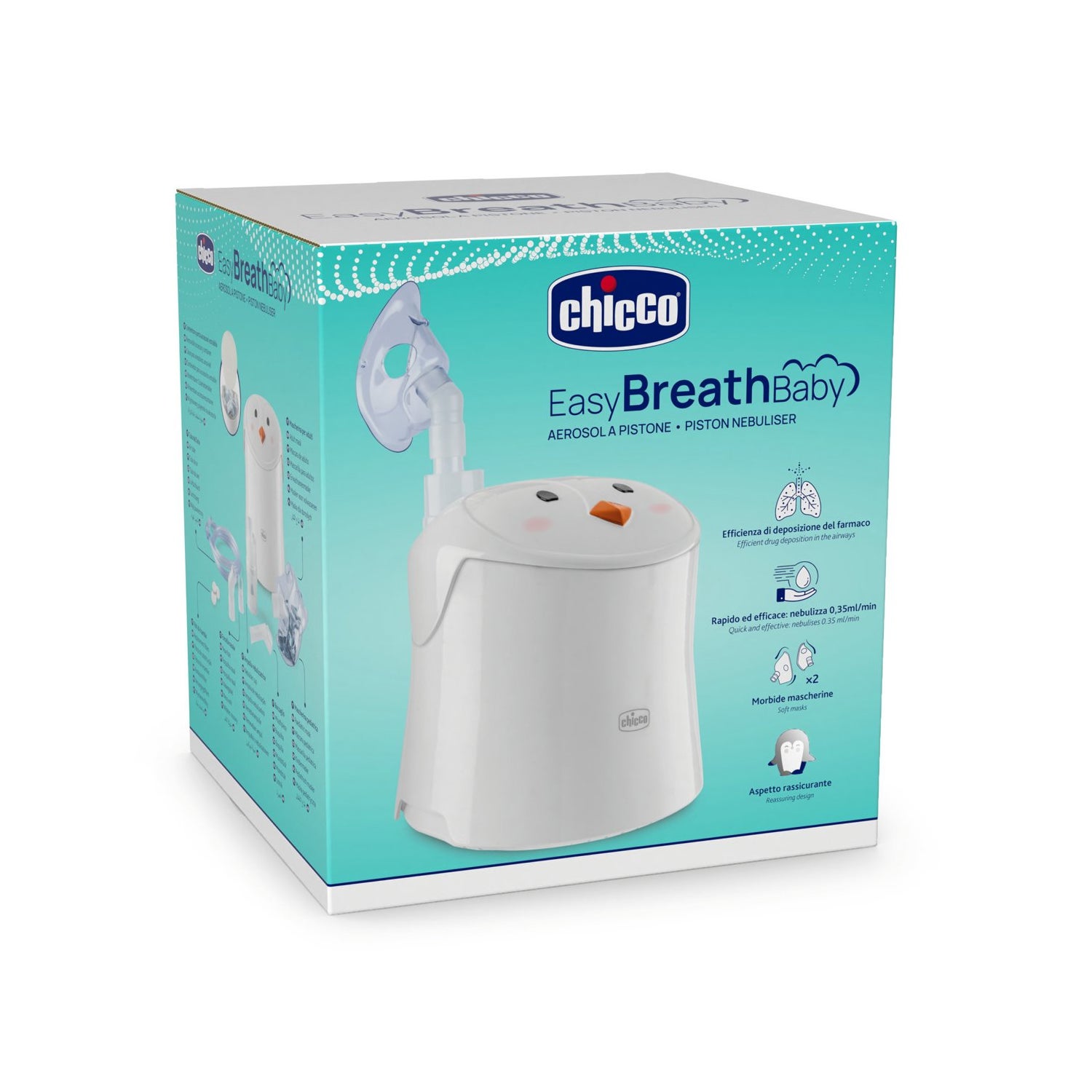 Chicco Easy Breath Baby Nebulizador é um nebulizador de compressor de pistão, projetado para ser compacto, silencioso e de fácil manuseio. Sua tampa apresenta um design atraente que imita a face de um animal amigável, criando um ambiente menos intimidador para as crianças durante o tratamento.