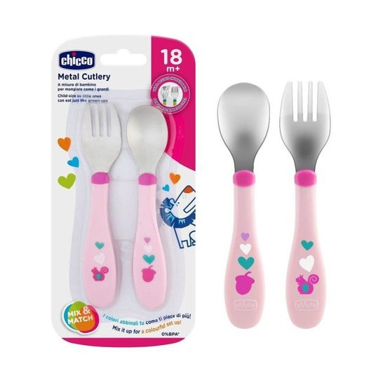 Chicco Easy Meal Talheres Inox 2uds é um conjunto de talheres com fixação segura para que as crianças comam de maneira autônoma.