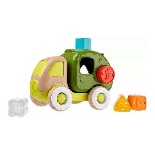 Camião de brinquedo com classificador de formas que ajuda a melhorar as actividades motoras dos bebés a partir dos 9 meses de idade. Fabricado com 80% de plástico reciclado e bioplástico de origem vegetal. Também ajuda a estimular a imaginação e a criatividade dos mais pequenos. Tem peças de encaixe com cores e texturas diferentes.