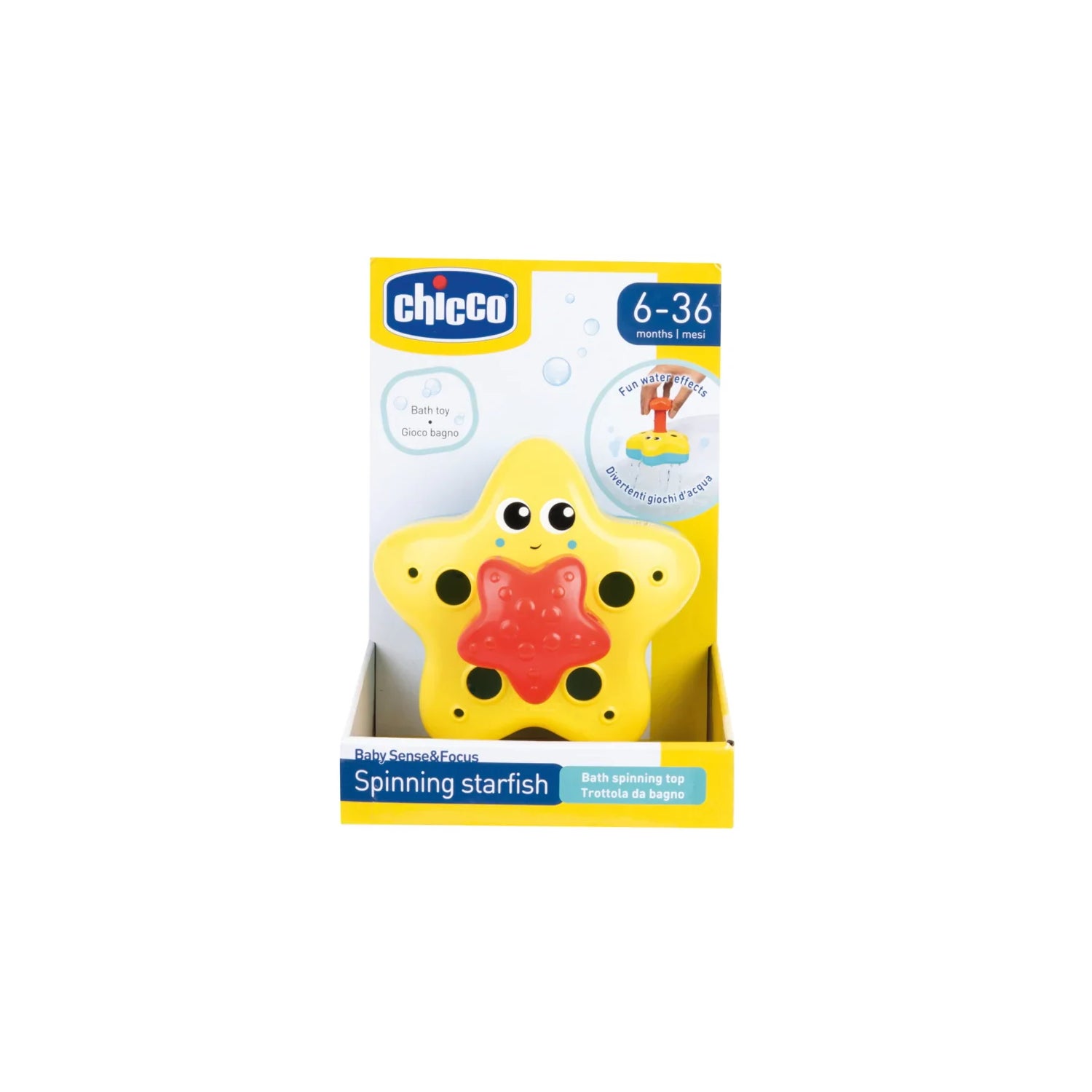 Chicco Estrela do Mar Gira Gira 6-36M é um brinquedo aquático projetado para tornar os momentos de banho do teu bebê mais divertidos. Este brinquedo em forma de estrela não só gera efeitos interessantes ao ser mergulhado na água, mas também gira sobre si mesmo, adicionando um elemento de entretenimento ao jogo.
