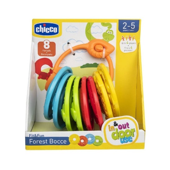 Brinquedo para crianças a partir dos dois anos de idade feito de materiais plásticos, inspirado no popular jogo de petanque. Tem 8 anéis concebidos com impressões de animais, que são atirados para um disco ou um pino de bowling. Ajuda a desenvolver a coordenação e precisão nas crianças, ao mesmo tempo que oferece diversão e estimulação. Inclui um anel no qual se pode armazenar e transportar o produto.