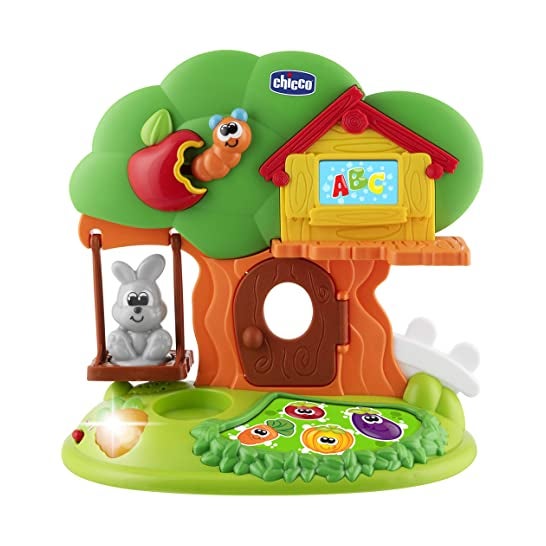 O jogo educativo bilíngue Chicco a Casa do Coelho apresenta o personagem de um coelhinho que ajuda as crianças a aprender os nomes dos vegetais, as cores, as letras e a canção ABC em dois idiomas diferentes.