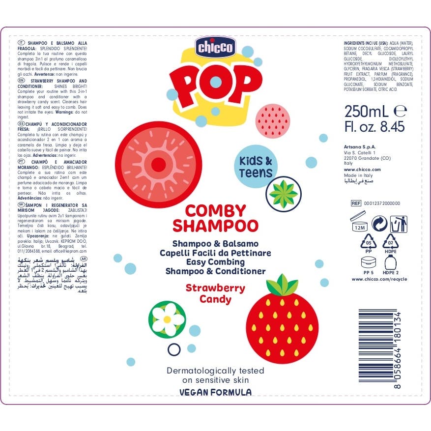 Chicco Pop Comby Champô & Condicionador Morango 250 ml é um produto projetado especificamente para crianças e pré-adolescentes. Este champô e condicionador 2 em 1 permite desfrutar de um cabelo que não só é fácil de pentear, mas também fica fragrante e macio.