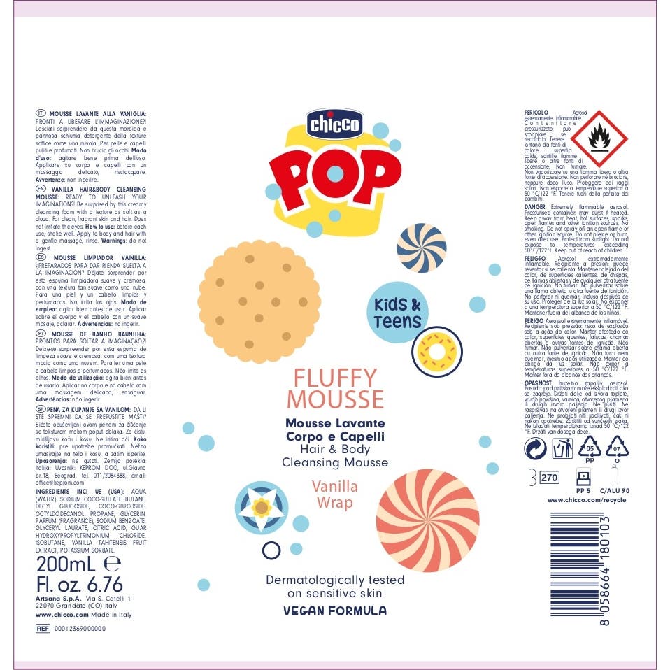 Chicco Pop Fluffy Espuma Corpo Cabelo Baunilha 200 ml é um limpador perfumado projetado especialmente para crianças e pré-adolescentes. Sua fórmula 2 em 1 permite utilizá-lo tanto no corpo quanto no cabelo, garantindo uma experiência divertida e sem complicações durante o banho.