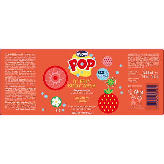Chicco Pop Kids & Teens Gel de Banho Morango 300ml é um gel de banho projetado especialmente para crianças e pré-adolescentes. Este produto transforma a rotina do banho em uma experiência agradável e divertida graças à sua fragrância irresistível.