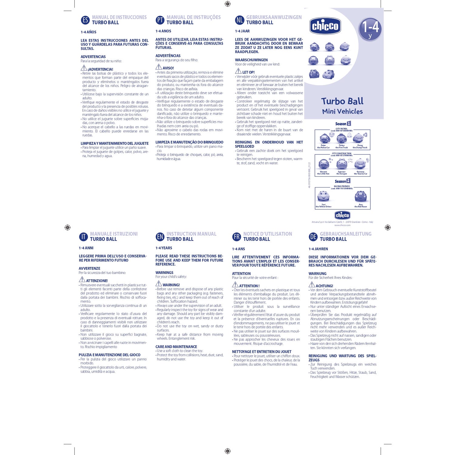 Chicco Turbo Ball Racing Friends é um conjunto que inclui dois mini veículos projetados para crianças de 1 a 4 anos. Esses veículos contam com uma função de retrocesso, o que permite que se impulsionem para frente ao soltar o veículo após tê-lo puxado para trás.