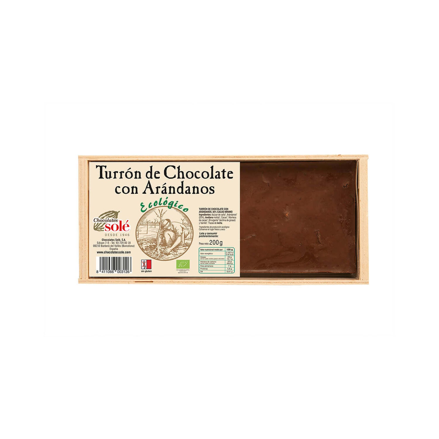 Chocolate nougat com mirtilos de origem biológica com certificado verde que garante que é um produto que foi feito com produtos da agricultura biológica, sendo amigo do ambiente. É um produto adequado para uma dieta vegetariana e não contém glúten.
