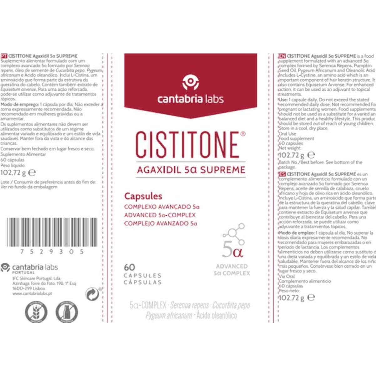 Cistitone Agaxidil 5α Supreme 60caps é um complemento alimentar indicado para a queda crônica de cabelo.