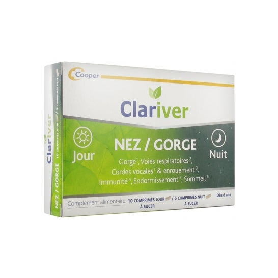 Clariver Nariz/Garganta 10 Comprimidos Dia + 5 Comprimidos Noite é um suplemento alimentar à base de vitaminas, extractos naturais de plantas e melatonina, recomendado à medida que se aproximam os meses mais frios do ano. Clariver Nariz/Garganta Dia e Noite distinguem-se pela sua dupla fórmula adaptada a cada hora do dia, oferecendo uma solução completa para aliviar os sintomas incómodos. Estas pastilhas contêm uma combinação única de ingredientes activos: vitamina C para promover a vitalidade, hortelã-pimenta para acalmar a garganta, eucalipto para facilitar a respiração e vitaminas B6 e B12 para reforçar o sistema imunitário. Além disso, a presença de melatonina na fórmula nocturna ajuda a reduzir o tempo necessário para adormecer.6 anos ou mais Os suplementos alimentares nunca devem substituir uma dieta saudável, variada e equilibrada e um estilo de vida saudável.