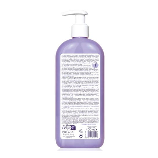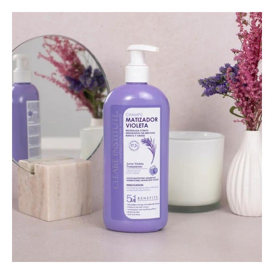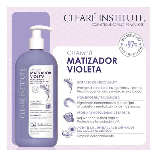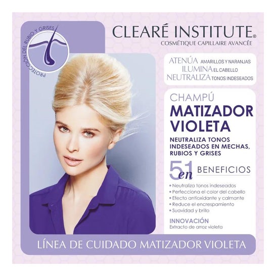 Champô Matizador Violeta. Este champô limpa e cuida suavemente o cabelo, reparando e protegendo a cor graças à mistura dos seus ingredientes cuidadosamente selecionados com efeito matizante que ajudam a neutralizar os tons alaranjados e amarelados para aperfeiçoar a cor do cabelo, dando mais vida aos tons loiros, descoloridos ou grisalhos, ao mesmo tempo que proporcionam suavidade e brilho, reduzem o frizz e têm um efeito calmante para que possa ser utilizado até em couros cabeludos delicados. É um tratamento completo com 96,6% de ingredientes naturais indicado tanto para homens como para mulheres.