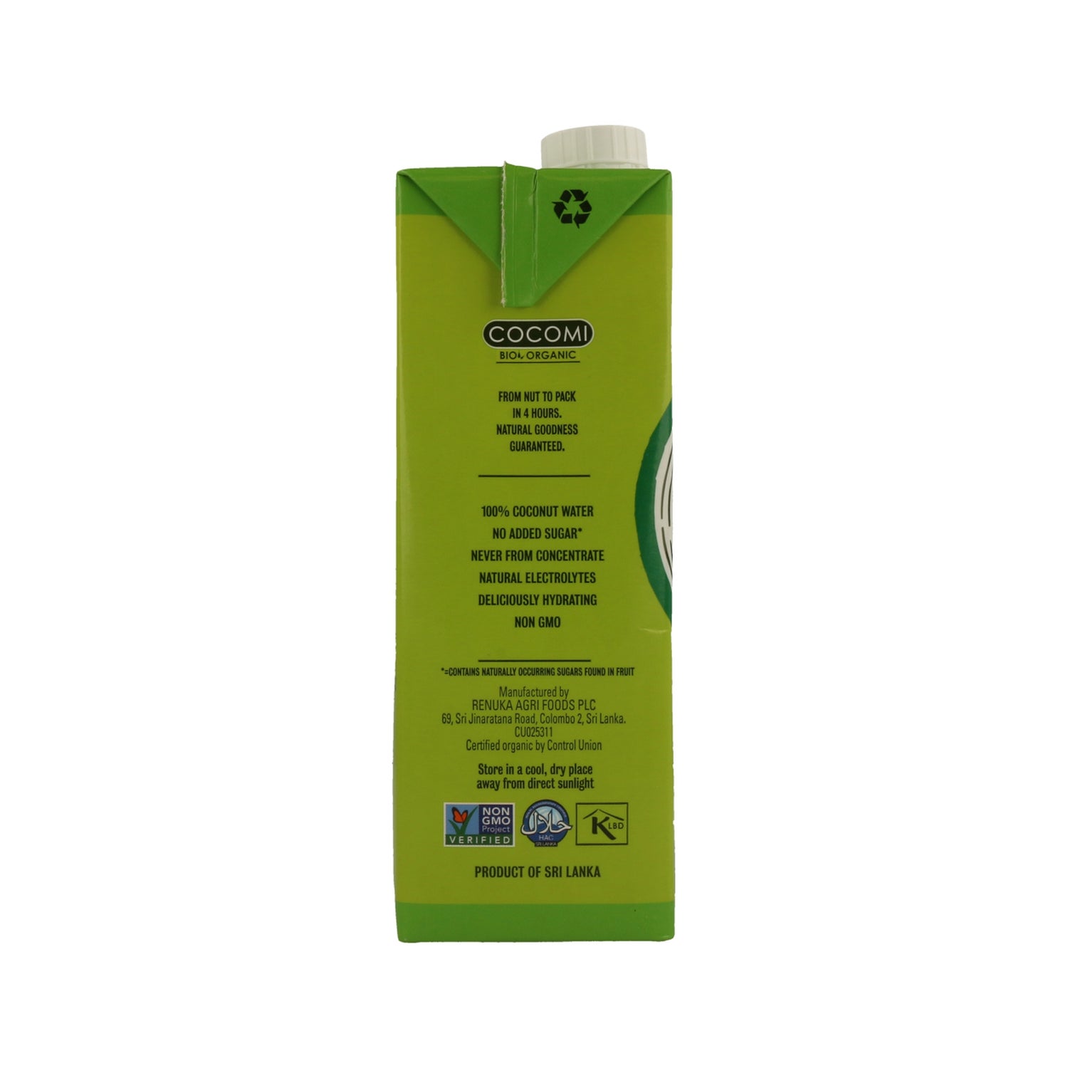 Água de coco orgânica do Sri Lanka. A composição contém apenas água de coco e vitamina C com conservante natural. A água de coco é rica em sódio, magnésio, cálcio, potássio e fósforo. É também uma bebida isotónica natural, ideal para reabastecer sais perdidos durante o exercício.